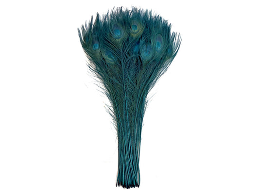 50 Pieces - 30-35" Turquoise Blue Dyed Over Natural Long Peacock Tail Eye Wholesale Feathers (Bulk)