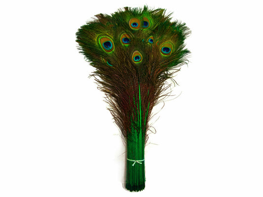 50 Pieces - 30-35" Kelly Green Bleached & Dyed Peacock Tail Eye Wholesale Feathers (Bulk)