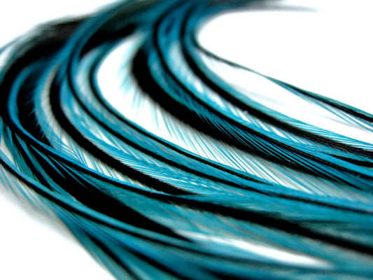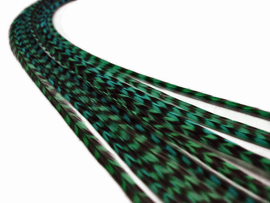 6 Pieces - XL Peacock Green Thin Grizzly Whiting Farm Rooster Hair Extension Feathers