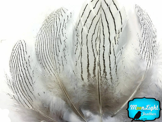 6 Pieces - Large Natural White Silver Pheasant Barred Plumage Feathers