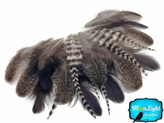1 Dozen - Medium Natural Grizzly Rooster Saddle Whiting Hair Extension Feathers