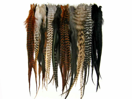 12 Strands - Sandy Mix Thin Long Grizzly Whiting Farm Rooster Salon Hair Extension Feathers