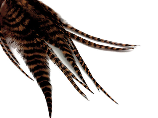 1 Dozen - Medium Brown Grizzly Rooster Saddle Whiting Hair Extension Feathers