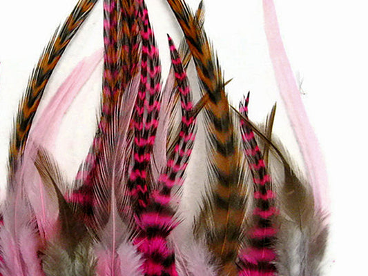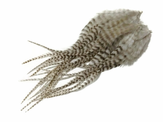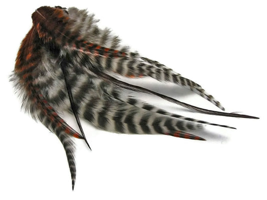 2 Dozen - Short Natural And Brown Grizzly Mix Rooster Hair Extension Feathers