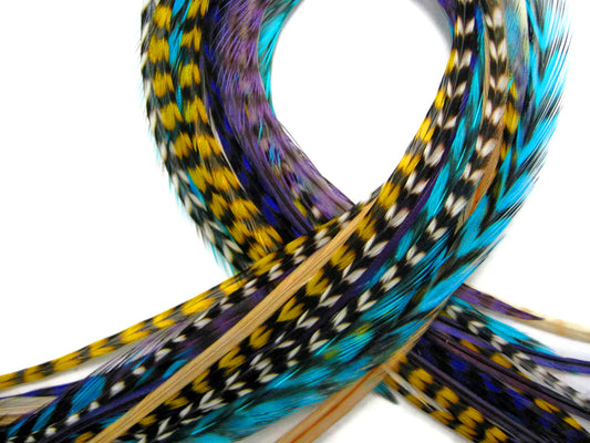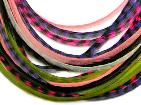 12 Strands - Candy Mix Thin Long Grizzly Whiting Farm Rooster Salon Hair Extension Feathers