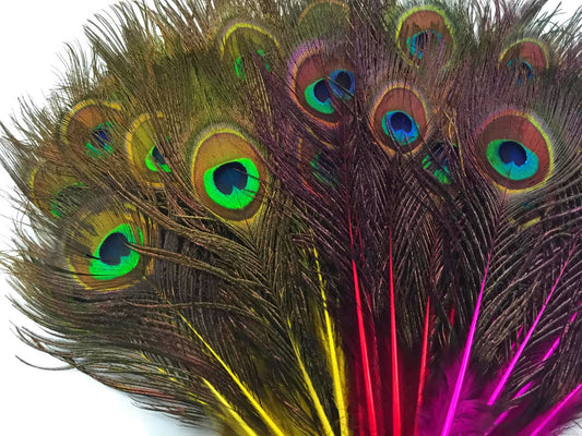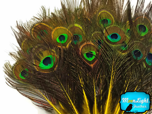 50 Pieces - 20-25" Yellow Dyed Over Natural Long Peacock Tail Eye Wholesale Feathers (Bulk)