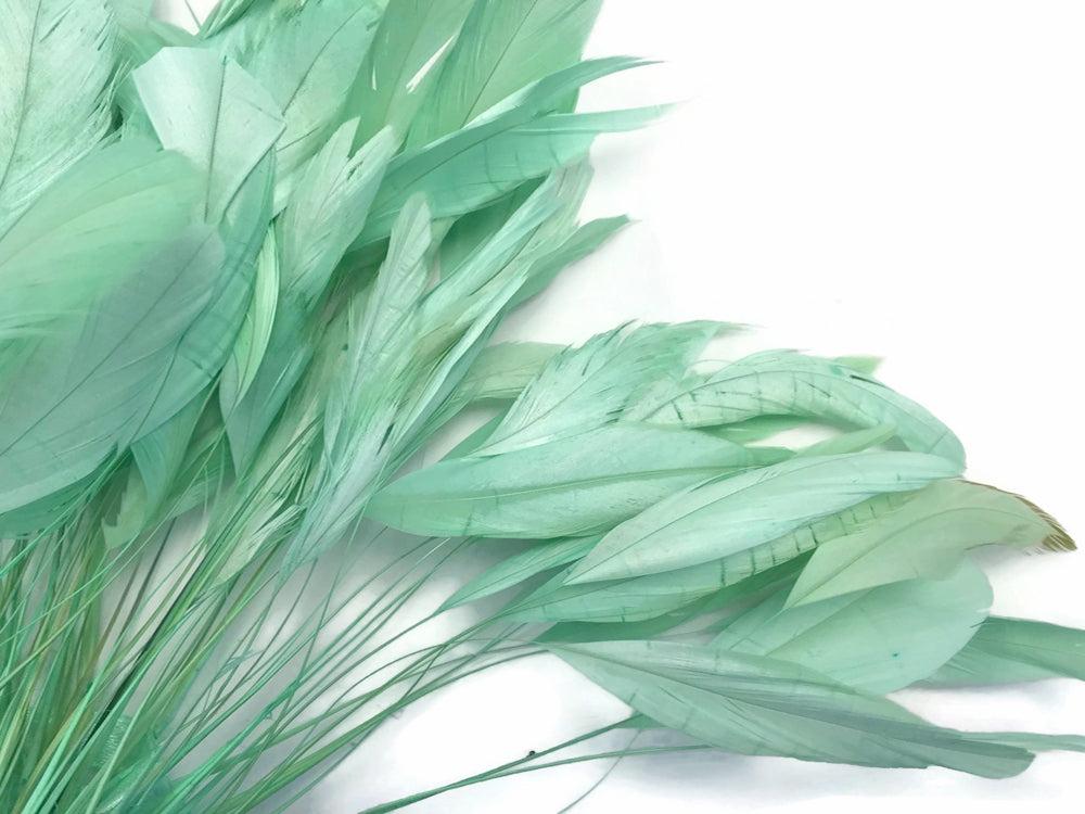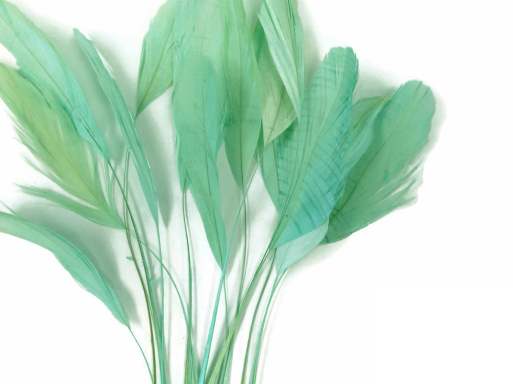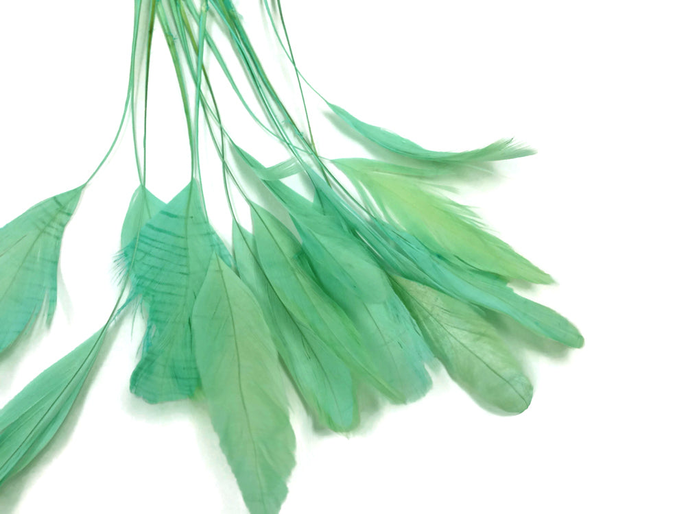 This listing is for 1 yard of Aqua Green stripped Coque Feathers (rooster tail feathers). They are sometimes called "eyelash" trim . It is a versatile decorative item with a wide variety of millinery, costume, purse, mask, boa, gourd, arts and craft and other applications. There are approximately 80-100 feathers in this yard.