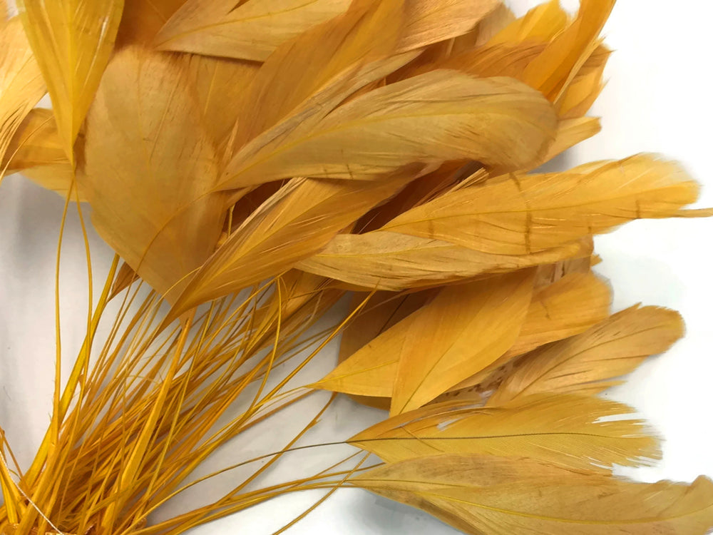This listing is for 1 yard of Golden Yellow stripped Coque Feathers (rooster tail feathers). They are sometimes called "eyelash" trim . It is a versatile decorative item with a wide variety of millinery, costume, purse, mask, boa, gourd, arts and craft and other applications. There are approximately 80-100 feathers in this yard.