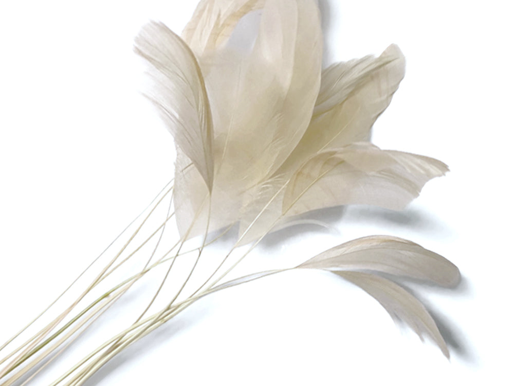 This listing is for 12 pieces of ivory stripped coque feathers (rooster tail feathers) sometimes called "eyelash" trim. The length of each feather is approximately 4-6 inches.