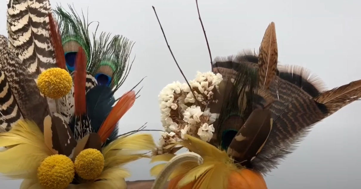 These little centerpieces are a great addition to your fall table. They make a fun craft with kids and will last thought the season. This kit includes golden pheasant tails in plase of the Lady Amherst Red Tips. Feathers only. Add your own dried flowers or accents and pumpkins to complete this look.