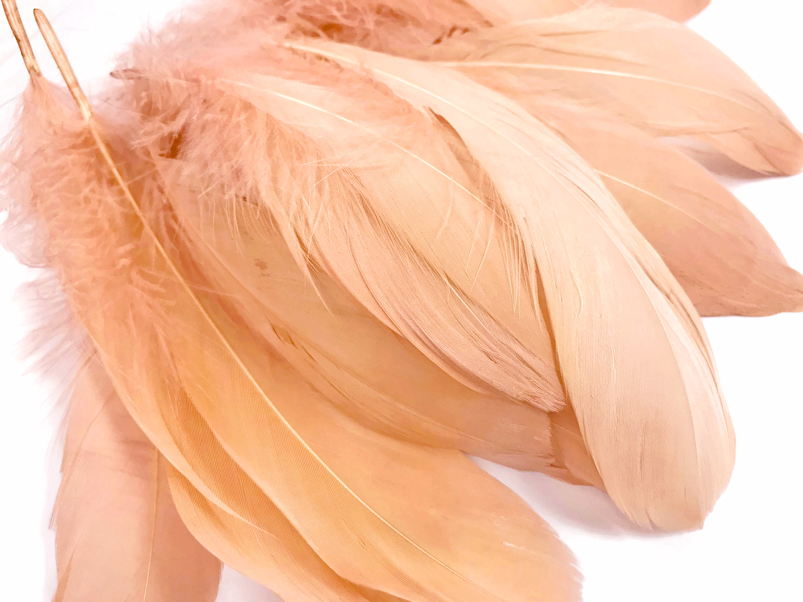 These goose nagoire shoulder feathers measure approximately 4–6 inches in length and about 1 inch in width. They feature a firm quill, a soft, wispy base near the stem, and a rounded, slightly curved paddle-shaped tip, offering both structure and natural elegance.