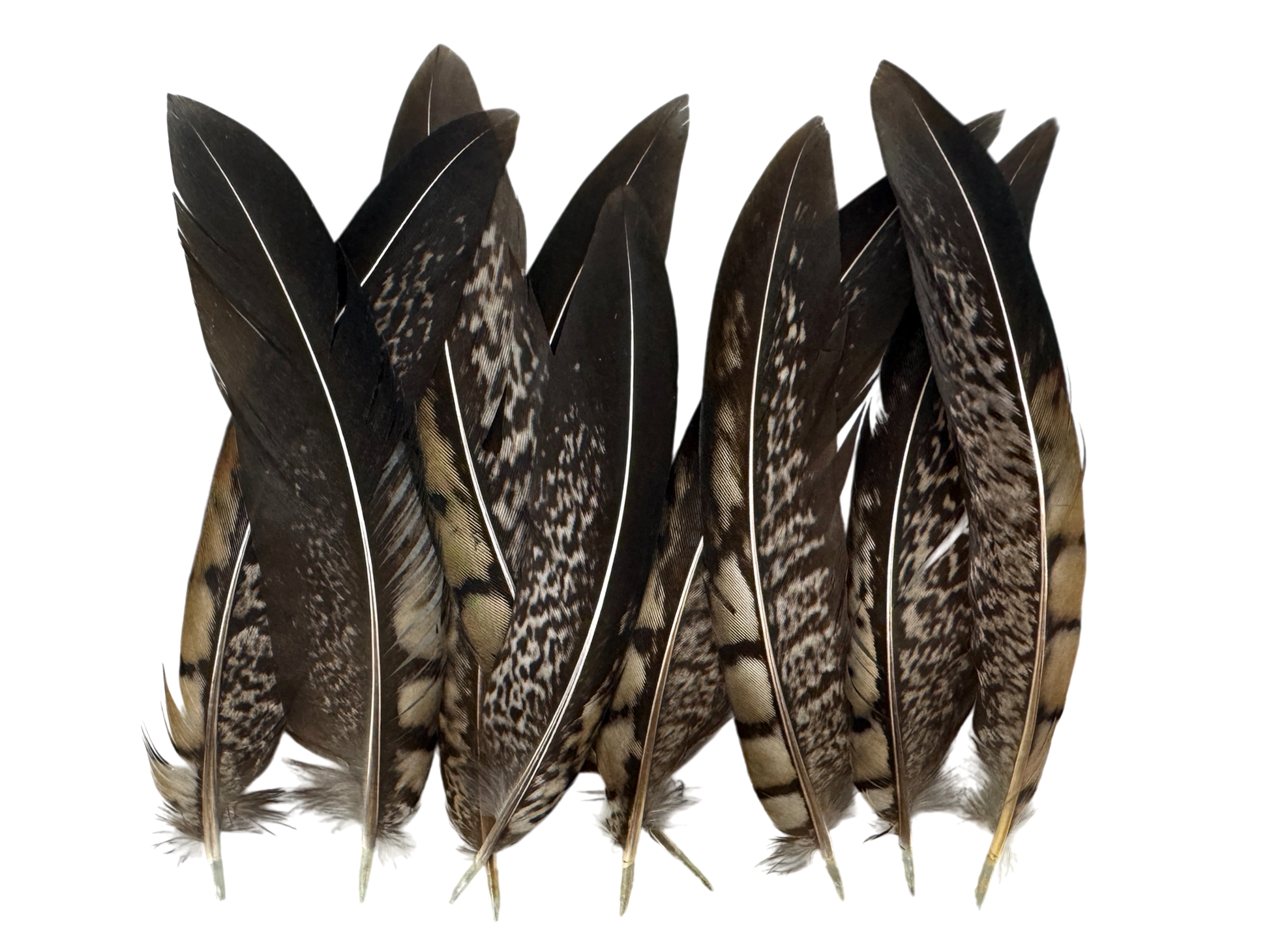 Enhance your creative projects with this set of 10 Lady Amherst pheasant tail feathers. Each feather measures approximately 6-8 inches and features the distinct brown and black pattern characteristic of Lady Amherst plumage.