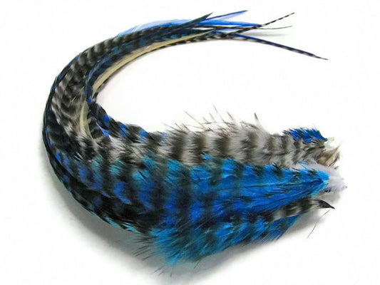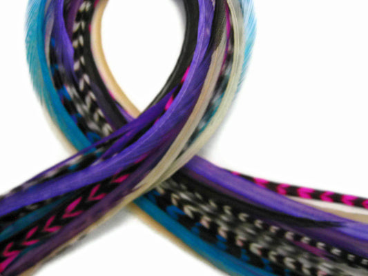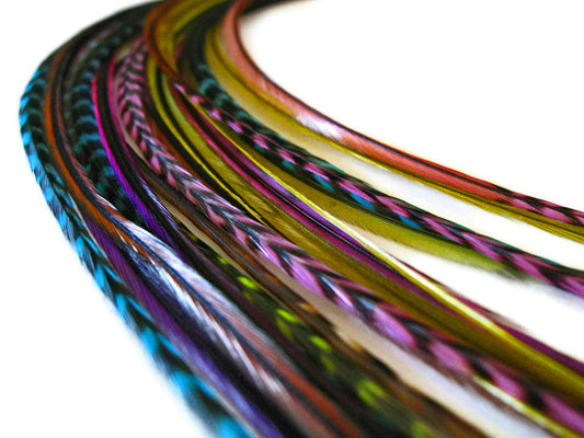 12 Strands - Jewel Mix Thin Long Grizzly Whiting Farm Rooster Hair Extension Feathers