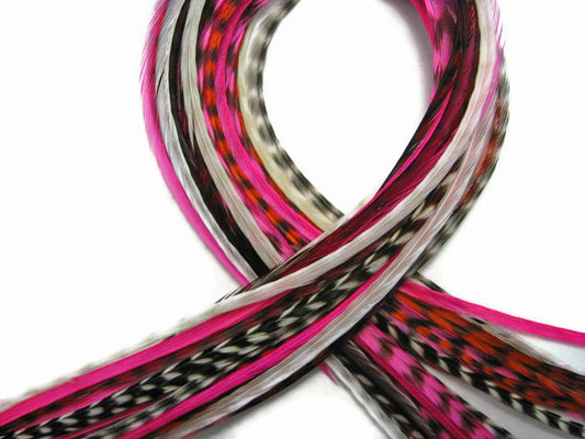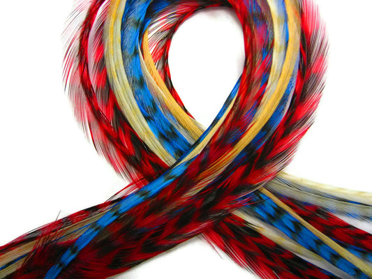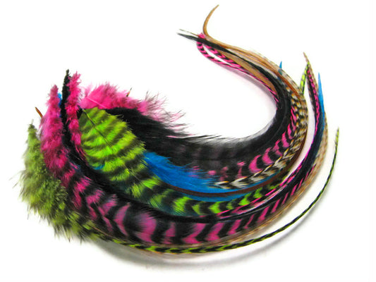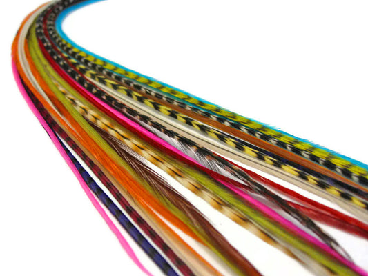 12 Strands - Hot Mix Thin Long Grizzly Rooster Hair Extension Feathers