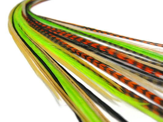 12 Strands - Army Mix Thin Long Grizzly Rooster Hair Extension Feathers